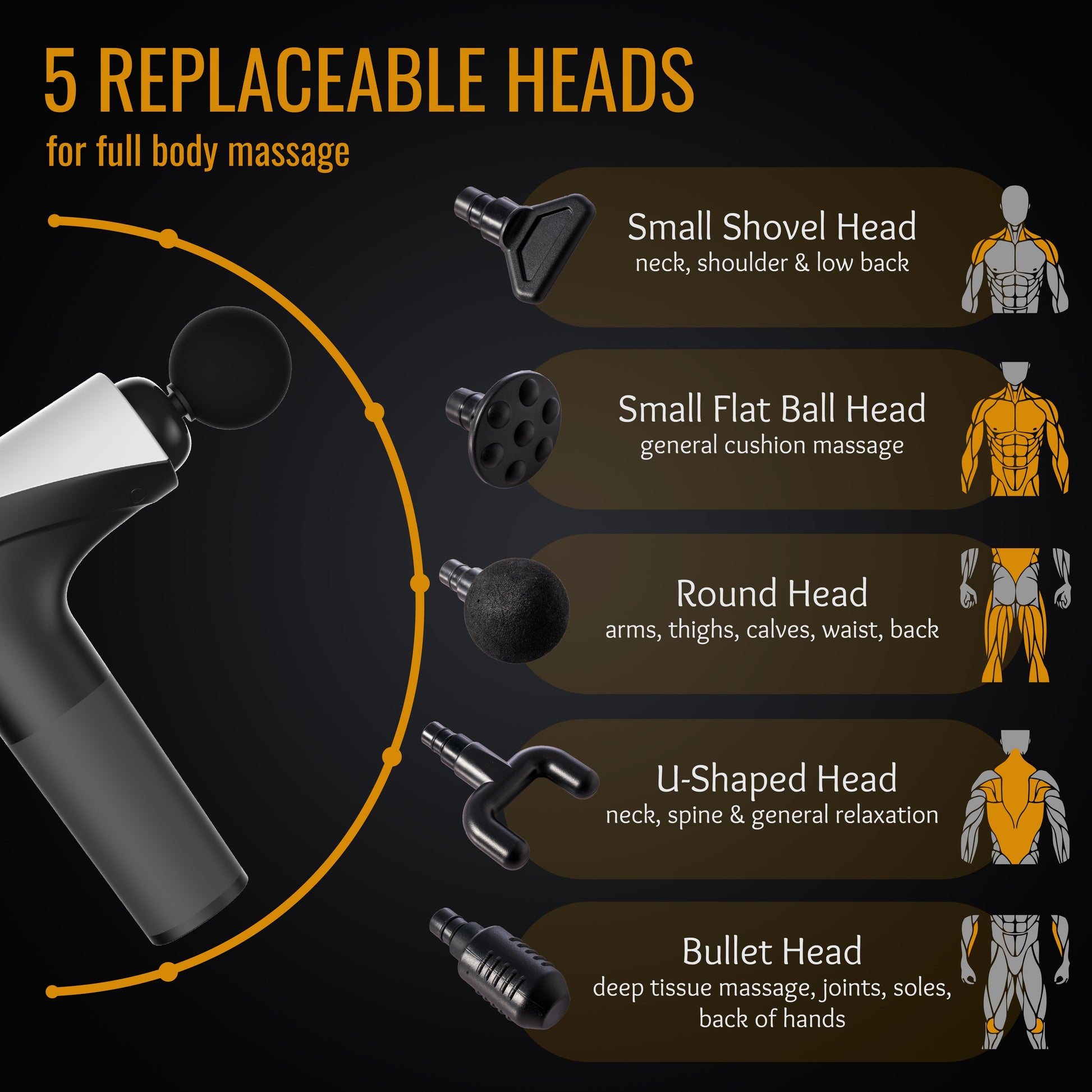 MULTIDIMENSIONAL MASSAGE: The deep tissue massage gun has 5 different massage heads, each of which is aimed at different muscle groups to promote blood circulation, decompose lactic acid, and relieve muscle soreness after exercise.